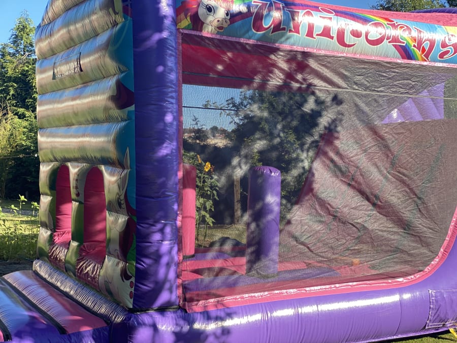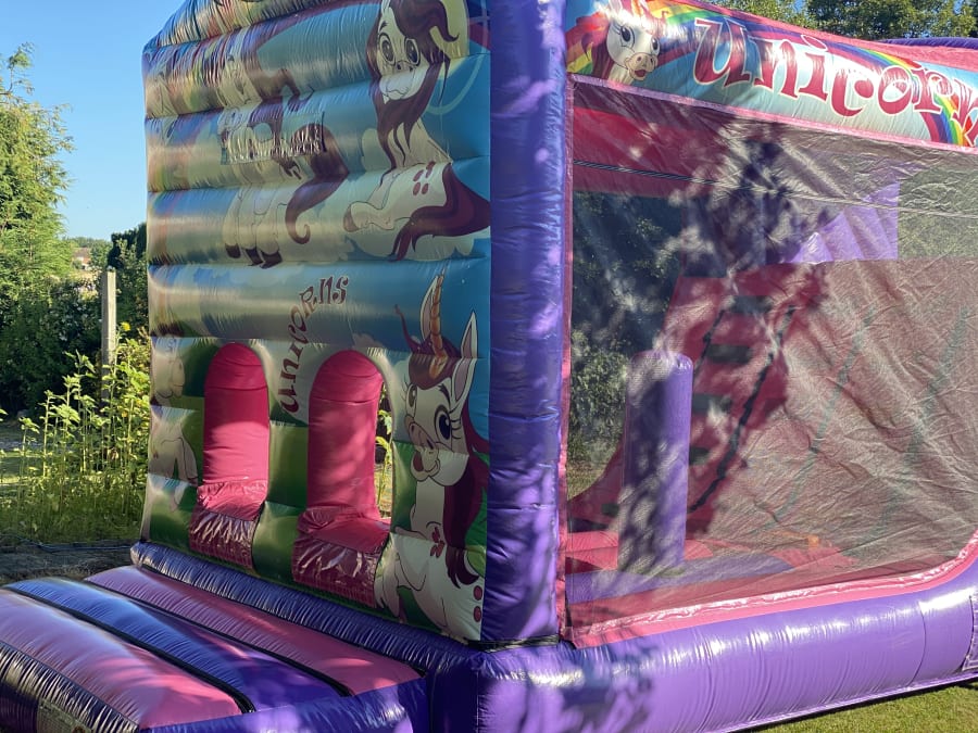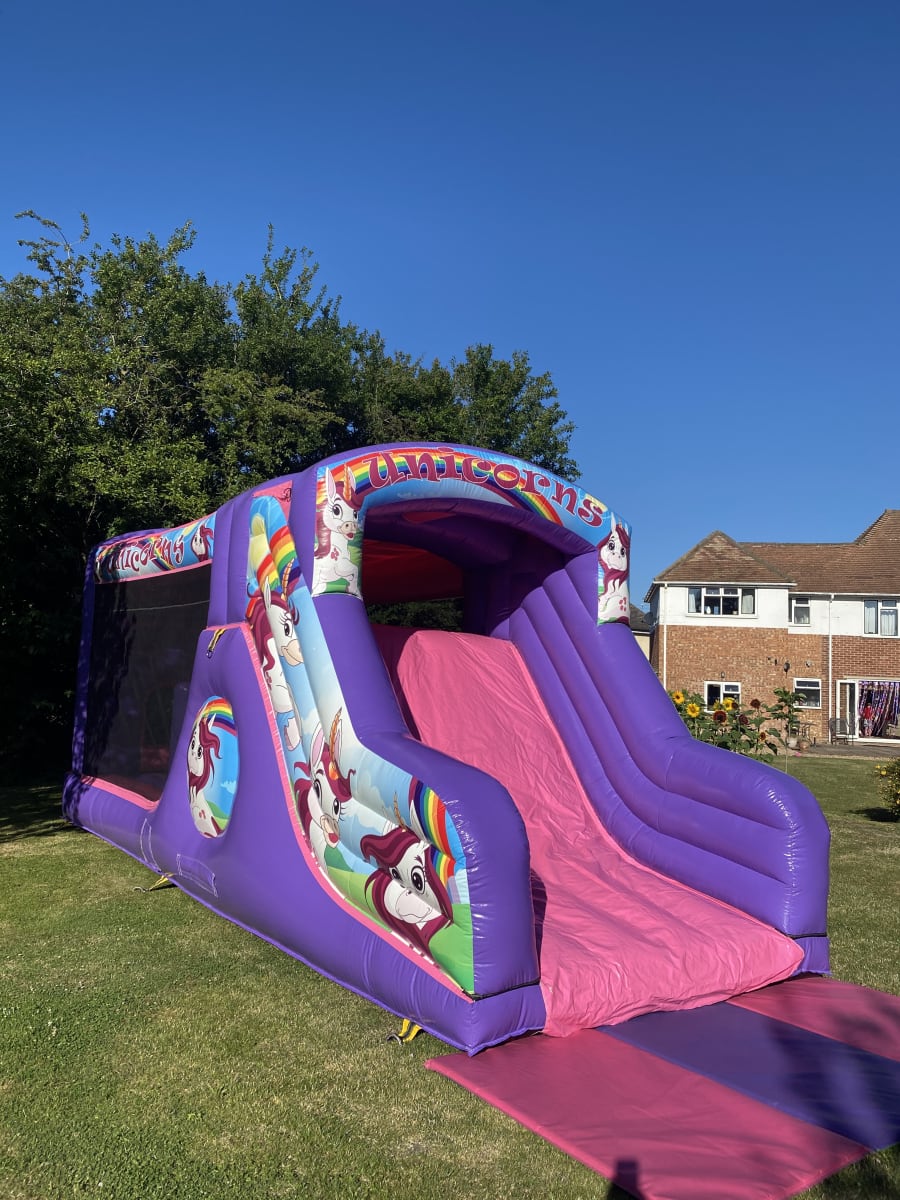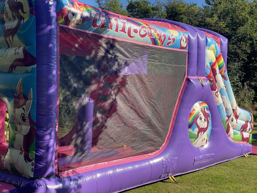 To book our beautiful Unicorn Mini Assault Course/Fun run you will need plenty of space, at 28ft in length & 10ft wide, you will require a space of at least 35ft in length & 17ft in width this is to allow safe anchorage, blower tube & safety mats, this area if outside needs to be natural grass & flat including the additional space required, with no obstructions such as washing line poles, tree stumps ect, we will also require a 4ft width access if booking for the garden, Please remember if booking for an indoor event, to check the ceiling height of the venue, our unicorn fun run is approx 12ft tall so indoor ceiling height of the venue will need to be at least 12.5ft tall, we are familiar with most local halls so can advise if in any doubt, or give hall recommendations please do call us 07852160861 or send a message via our contact page.