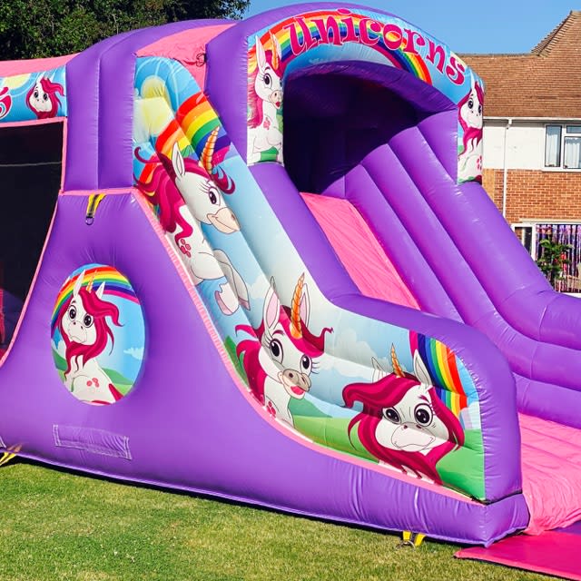 Our new Unicorn mini assault course/fun run is just perfect for an all rounder party piece, the kids will love this & it will be the talk of your party, unicorns are massive at the moment & loved by both girls & boys, boasting of 28ft in length they’re is plenty to keep the kids entertained, offering a bounce area inside along with biff bash pop ups, they’re are climbing steps inside that take you to the entrance of an 8ft slide to exit, so much fun to be had by all! Designed in high gloss material, displaying beautiful & highly colourful unicorns, this is one party trick that you don’t want to miss out on 🦄