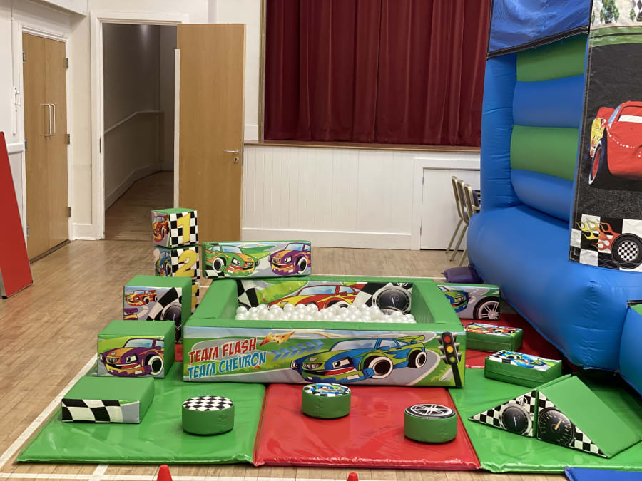 Our Cars Bouncy Castle & Soft Play Package is suitable for most halls & community centres.