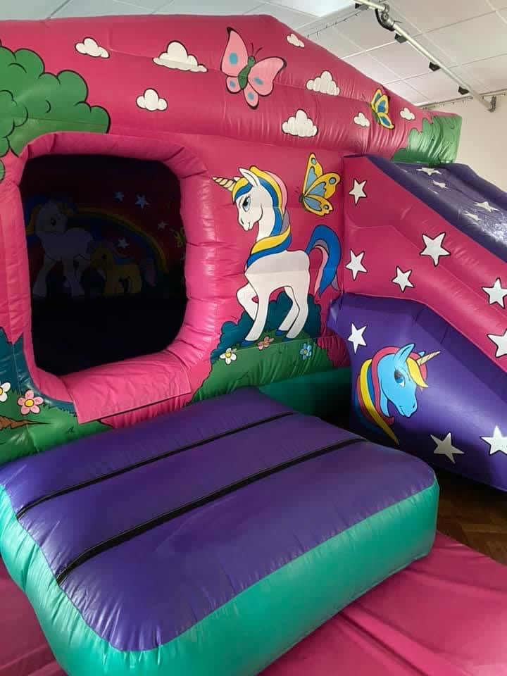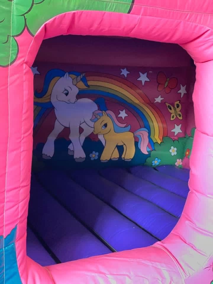 Our Enchanted Unicorn Bouncy Castle is great for most gardens, halls, & community centres & low height venues.