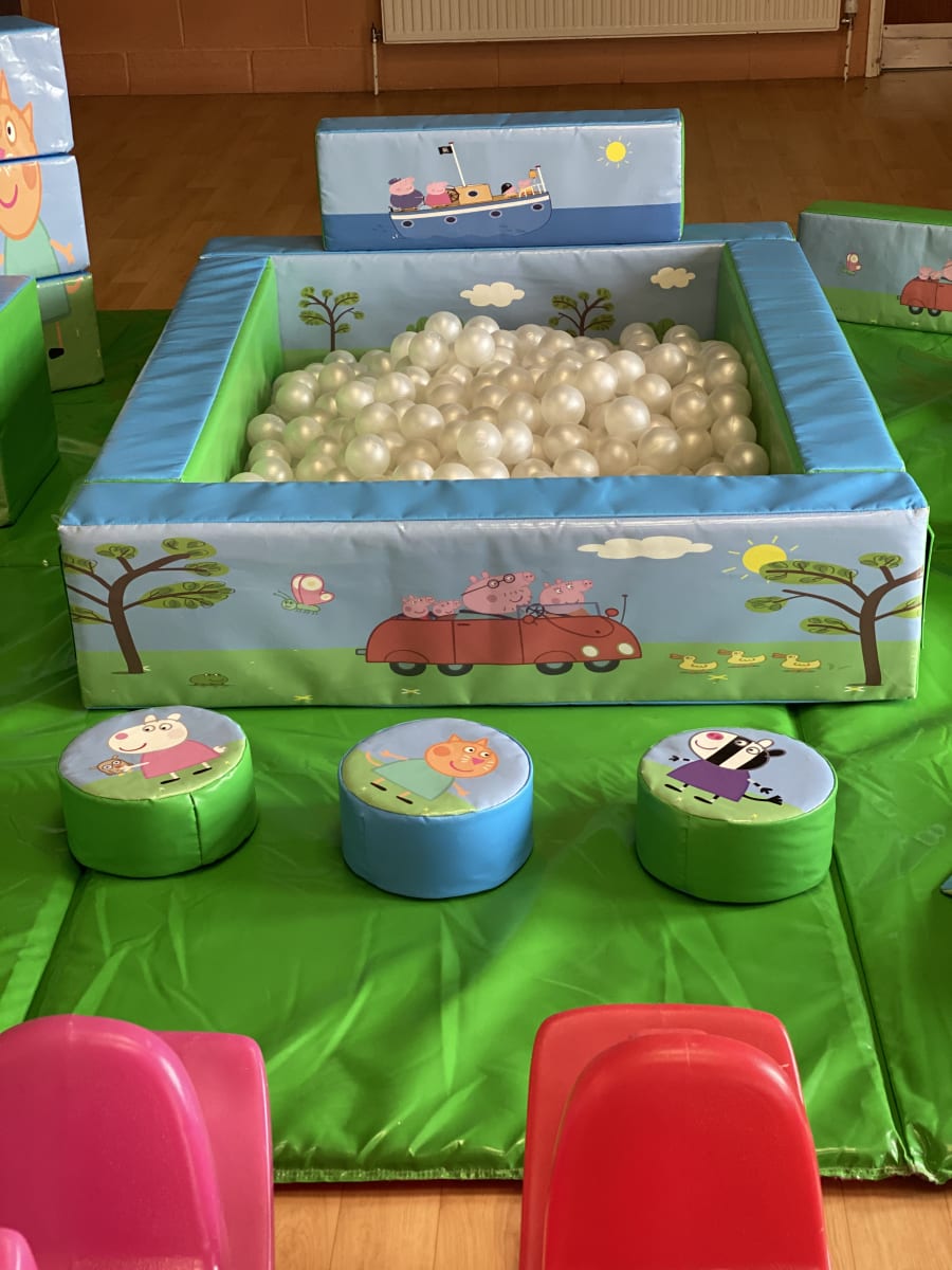 Our lovely Peppa Pig Bouncy Castle & Soft Play Package, is a perfect choice for your little one to celebrate, super popular & loved by kids of all ages, they will have so much fun bouncing around with their friends on the castle & diving into the matching soft play, building & stacking the various shapes to create wacky creations, and jumping into the matching ball pit, which will be filled to the brim with white pearlised balls, to compliment this set we have added 2 Hoppers & ride on toys, we have a bolt on section, where you can add extra's if you wish, the rockers are a good choice if your guests are all little as is the Cozy Coupes, we can even do those in a package with our Crazy Coupe Party, definitely a popular choice to add on, maybe a few Didi cars if children are slightly older, super fun & loved by all, our Giant Peppa Hopscotch is great to accompany this package, why not take it up a level and add our beautiful Children's Wooden Tables & Chairs, whatever you decide we can help create your perfect package.