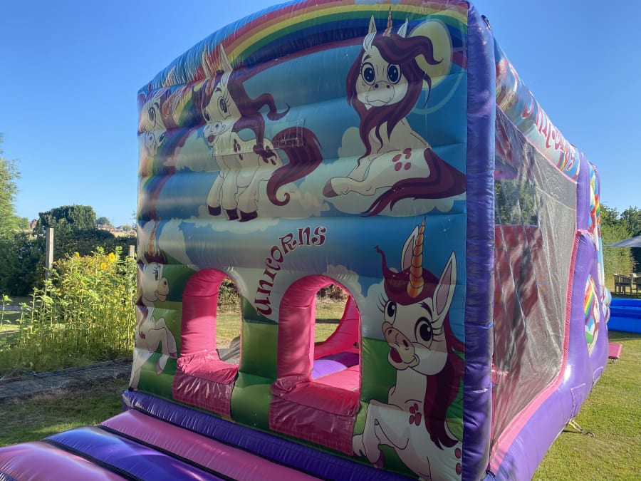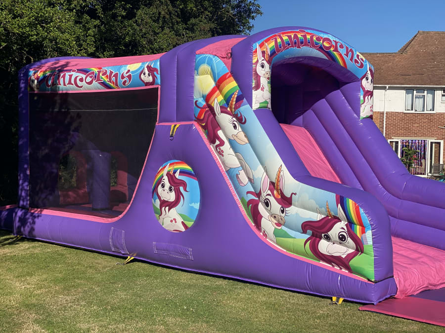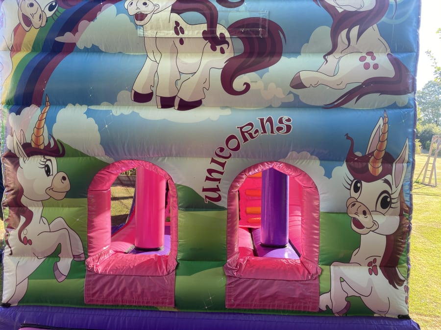 To book our beautiful Unicorn Mini Assault Course/Fun run you will need plenty of space, at 28ft in length & 10ft wide, you will require a space of at least 35ft in length & 17ft in width this is to allow safe anchorage, blower tube & safety mats, this area if outside needs to be natural grass & flat including the additional space required, with no obstructions such as washing line poles, tree stumps ect, we will also require a 4ft width access if booking for the garden, Please remember if booking for an indoor event, to check the ceiling height of the venue, our unicorn fun run is approx 12ft tall so indoor ceiling height of the venue will need to be at least 12.5ft tall, we are familiar with most local halls so can advise if in any doubt, or give hall recommendations please do call us 07852160861 or send a message via our contact page.