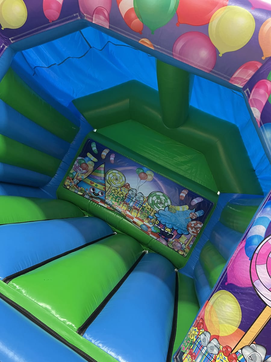 Our Party Celebration Bouncy Castle, is a great choice for any event, it full of lots of vibrant colours, suitable for both boys & girls, its a happy castle! The kids will love jumping & bouncing around on this castle whilst eyeing up all the lovely sweets in a party atmosphere with all the different coloured balloons.