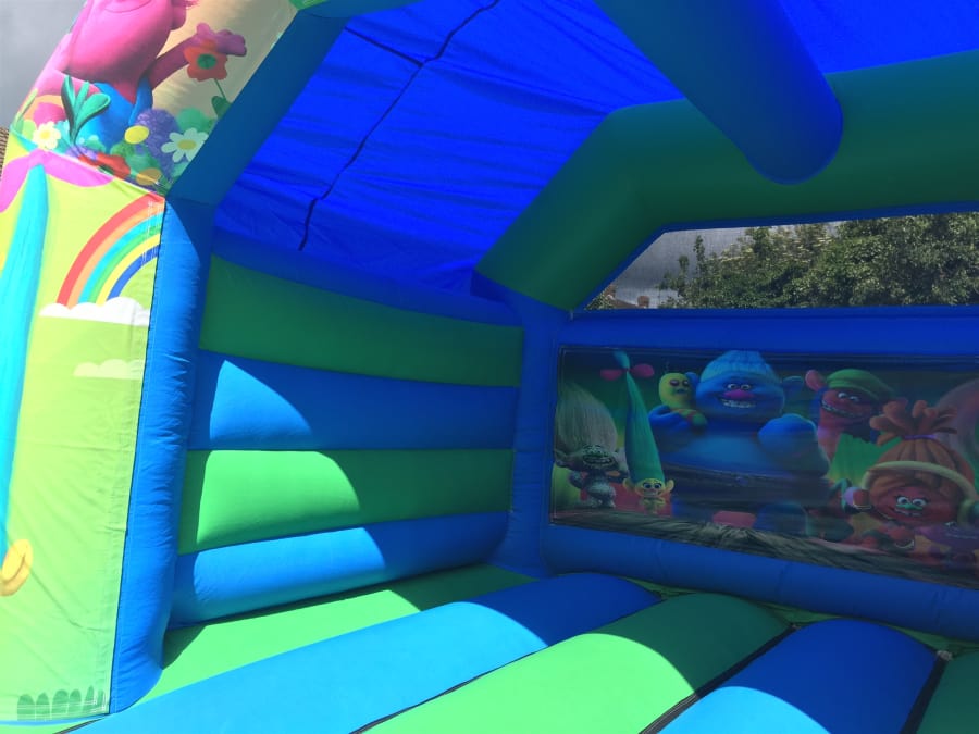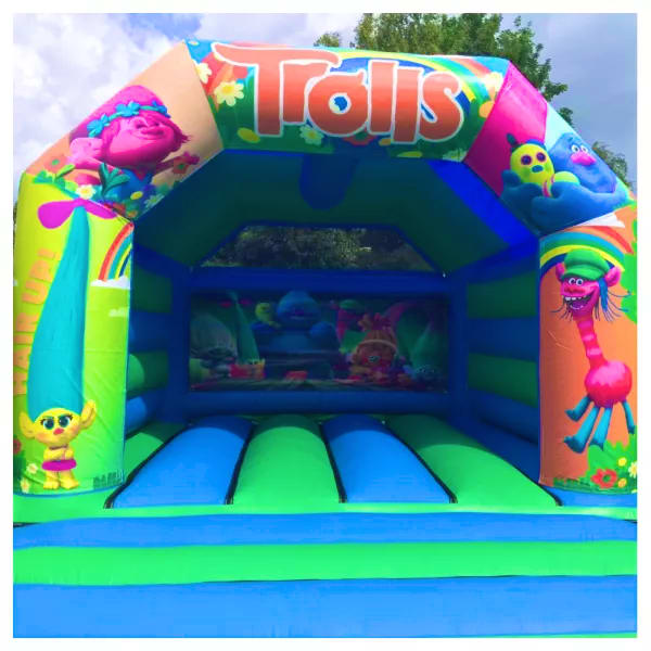 Our Trolls Bouncy Castle is great for most gardens, halls, & community centres.