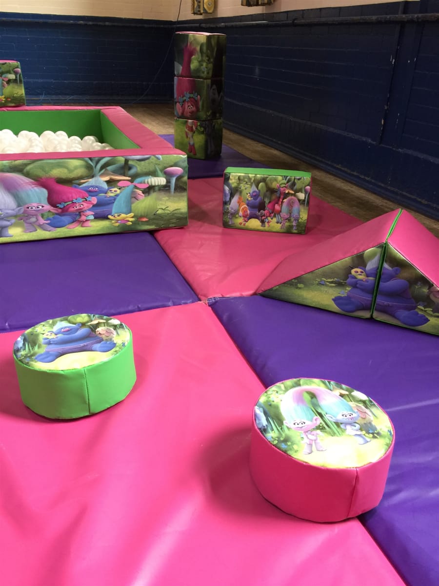 Our Trolls Bouncy Castle & Soft Play Package is suitable for most halls & community centres.