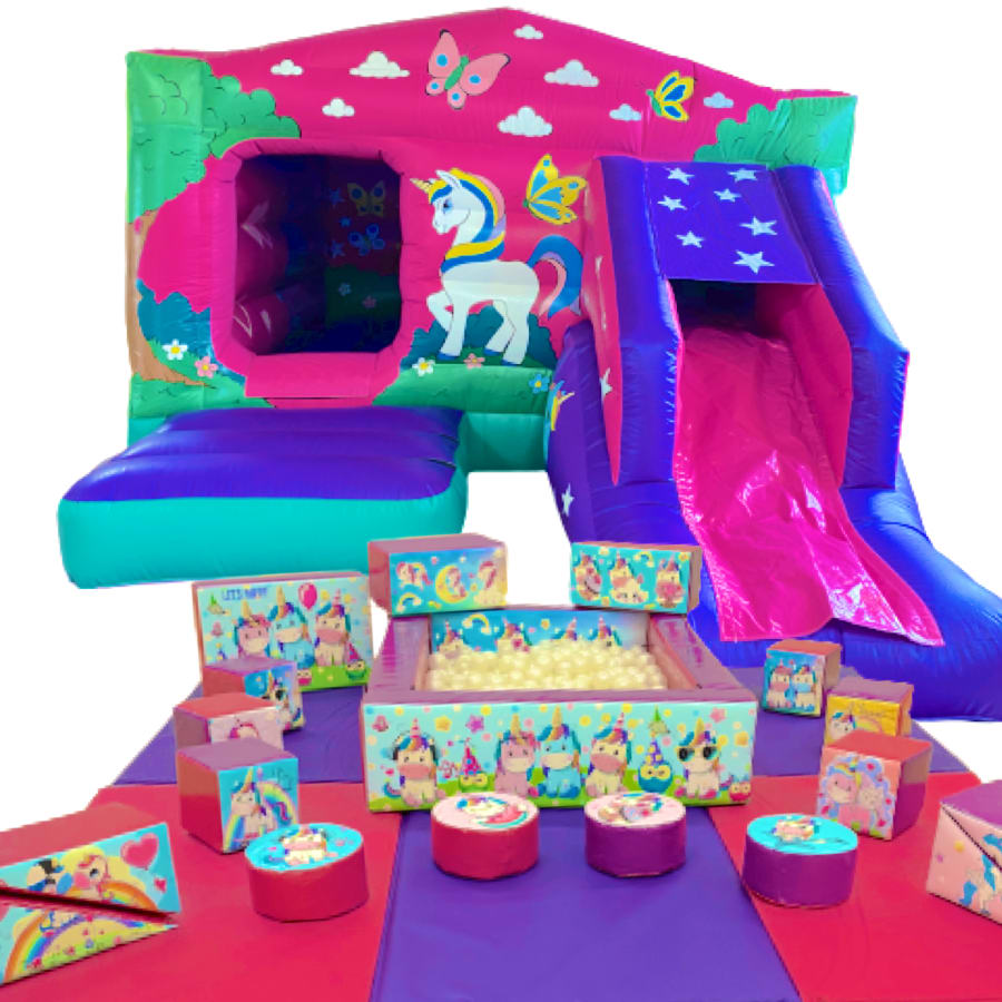 Our Unicorn Party Bouncy Castle & Soft Play Package is suitable for most halls & community centres.