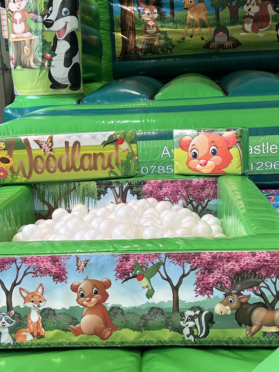 Woodland theme is such a lovely theme to have at your celebration, it's truly beautiful, the graphics are outstanding, with all the colourful woodland animals, such as badgers, deer's, foxes, bears, rabbits & so much more, the castle is low height at just 8.5ft tall, glossy & full of colour, with a good size bounce area, the little ones will love bouncing around with their friends & then jumping into the ball pit filled with pearl coloured balls, stacking & building all the various shapes, which includes circles, triangles, rectangles & cubes, all with wonderful graphics of woodland friends, sitting & chilling on the large soft play squirrel rocker or the soft play ladybird, to accompany this set we will add 4 extra's which will scuttle bug ride on's & hoppers, want a few extra's? take a look in our Bolt On Section, here you will find things like Rockers, Cozy Coupes, Didicars, even our Children's white wooden tables & chairs, which will look perfect with this package, want to go large by adding our woodland theme junior Woodland Slide, we have this combined in our Woodland Themed Deluxe Package.