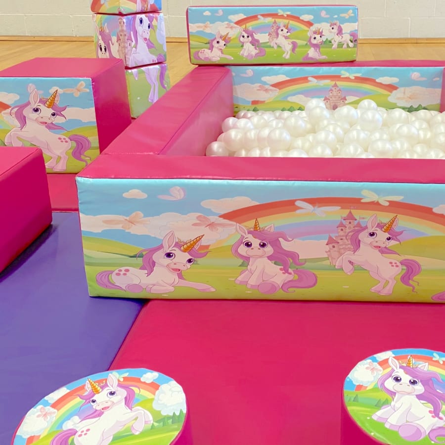 Our beautiful Unicorn Soft Play is a must for your little one to enjoy their celebration, unicorns are massively popular at the moment & this set is no exception, comprising of 17 various shapes including triangles, circles & stacking picture cubes, this set really is a party pleaser, with its stunning artwork, accompanied with a highly colourful beautiful matching ball pit and which will be filled with approximately 500 Pearl Balls.